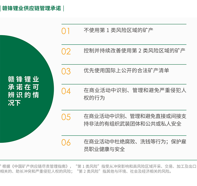 公司遵循《经济合作与发展组织受冲突影响和高风险区域矿石负责任的供应链尽职调查指南(第三版)》《中国对外矿业投资行业社会责任指引》《中国矿产供应链尽责管理指南(第二版))等文件,于内部制定了《负责任矿产资源供应链管理政策》等文件,并基于政策要求供应商签署《供应商行为准则》《不使用冲突矿产承诺书》邀请供应商填写矿物报告、KYS 等调查表,引导和规范上游锂矿供应商行为,完善锂供应链尽责管理,鼓励其承担更多的环境和社会责任。